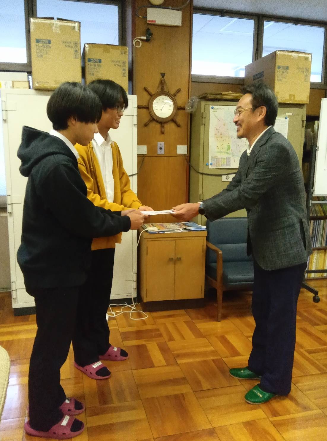 本日校長室にて緑友会川本会長よりお2人に激励金を贈呈。